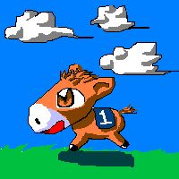 Description: A donkey wearing number tag: 1 is racing down the field.