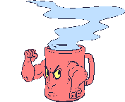 Description: A cup shows off his muscles while smoke steams out ontop of him.