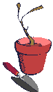 Description: A shovel lays beside a pot where a red pepper grows